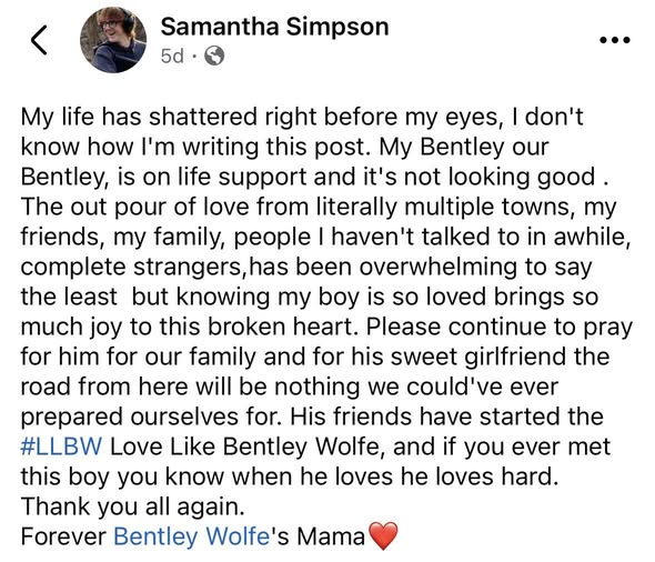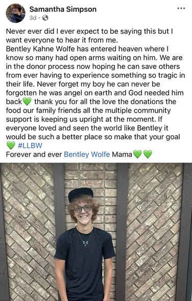 Now, as the community grieves, Bentley Wolfe is being remembered not only as a student and teammate, but as a young life that touched many others. In his final act, his family ensured that the generosity people saw in him every day would live on — giving hope to strangers who will never forget the name of the boy from Chrisman.