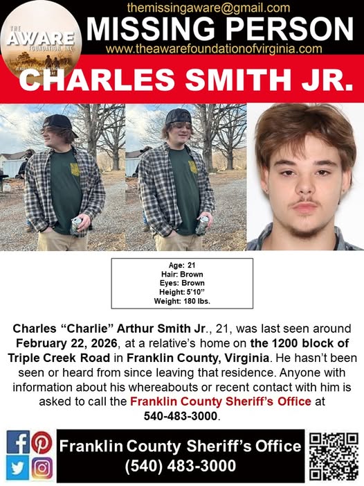 Franklin County, Va. — The desperate search for 21‑year‑old Charlie Arthur Smith Jr. ended in heartbreak for his family and a tight‑knit community. Charlie, who had been missing since February 22, was found dead by authorities on March 17 after more than three weeks of tireless looking by loved ones and volunteers.
