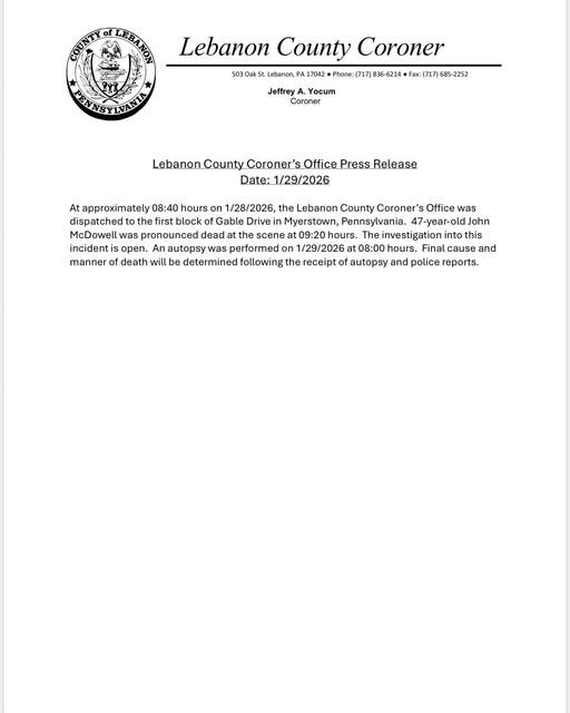 The Lebanon County Coroner’s Office has identified the man as John McDowell and confirmed that an autopsy has been completed, though the final cause and manner of death are still pending the results of that exam and the ongoing investigation. State Police and the Pennsylvania Office of the Attorney General are jointly handling the probe.