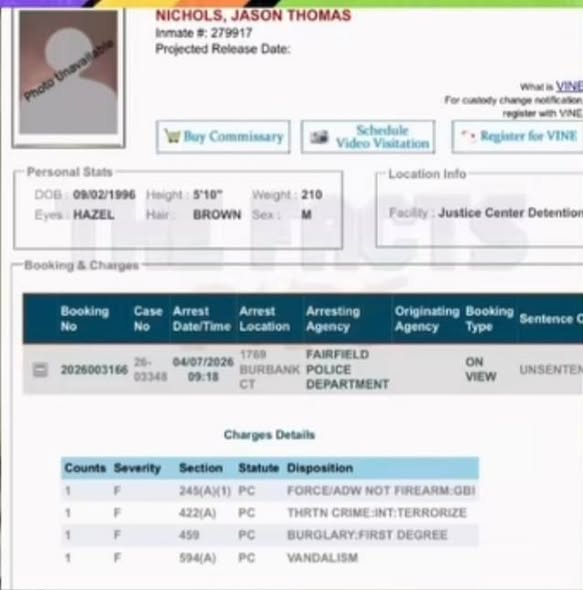 Investigators say Nichols now faces four serious felony charges, including first-degree burglary, assault with a deadly weapon not involving a firearm, criminal threats with intent to terrorize, and vandalism. Bail has been set at $35,000, and he is expected to appear in court on April 13 at Fairfield Superior Court.