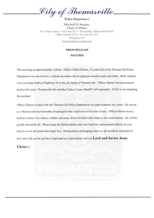 Back in Thomasville, the loss is being felt deeply. Police Chief Mitchell Stuckey spoke plainly about the officer’s impact, calling Hinton a strong and dependable member of the department. In a small agency, every officer matters, and Hinton’s absence has left a heavy silence among his colleagues.